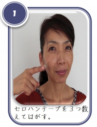 ノーメイクの状態で、セロハンテープを頬のふくらみに貼り、3つ数えてはがす(写真①を参考にしてください)。