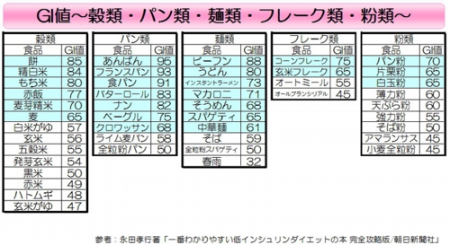 GI値~穀物類・パン類・麺類・フレーク類・粉類~